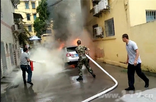 小車著火行人退避,唯有一人逆火前行